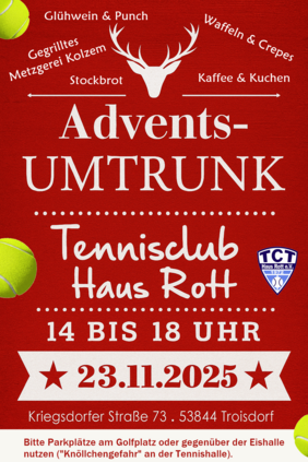 Unser traditioneller Adventsumtrunk findet dieses Jahr am Sonntag, dem 23.11.2025. von 14 bis 18 Uhr statt. Bei Glühwein, Gulaschsuppe und Leckereien vom Grill wollen wir mit Euch in die Adventszeit starten. Selbstverständlich dürfen Kaffee, Kuchen, Waffeln & Crepes nicht fehlen. Für die Kinder gibt es Stockbrot am Lagerfeuer.